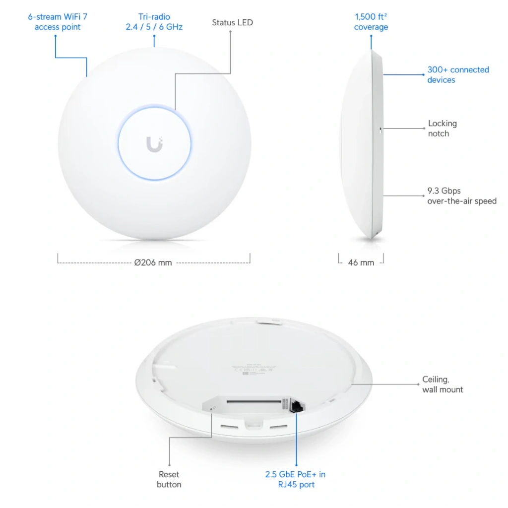 UniFi U7 Pro üzerindeki radyo kartlarına eş zamanlı bağlantı desteği sayesinde 9.3 Gbps'ye kadar kablosuz iletişim hızı sağlarken eş zamanlı 300+ aktif kullanıcıya kadar kesintisiz hizmet sağlayabilmektedir. Son kullanıcı odaklı iç mekan kablosuz ağ altyapı projelerinde veya iç mekan kablosuz otomasyon altyapılarında yüksek performans ve stabilite hedeflenerek geliştirilmiş donanımı ve büyük çaplı kablosuz ağ altyapılarında  kolay kurulum/yönetim/bakım ihtiyaçlarınızı karşılayan, UniFi İşletim sistemi ile bütünleşik çalışan kontrol yazılımı sayesinde esnek ve ölçeklendirilebilir bir kablosuz ağ altyapısı imkanı sunulmaktadır.